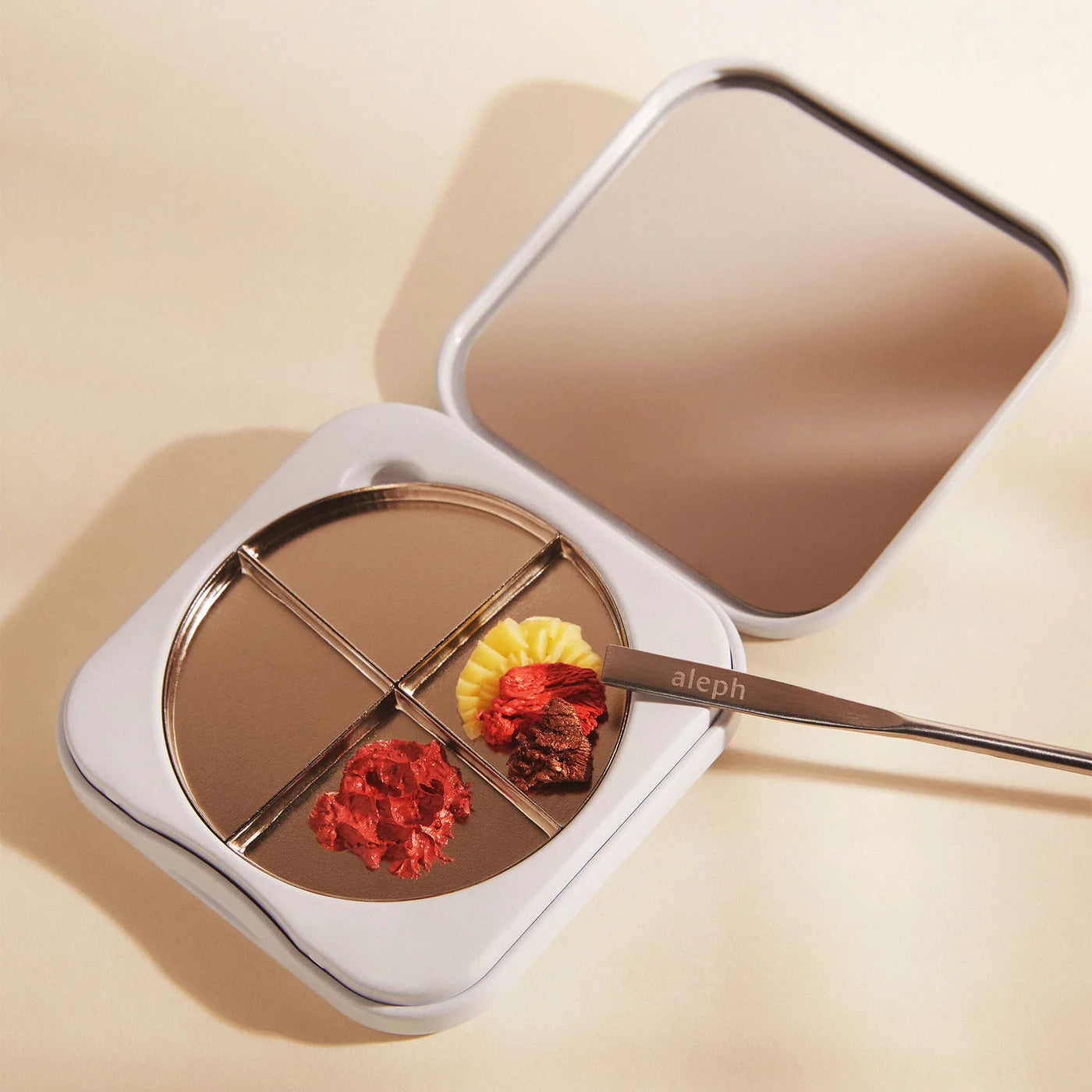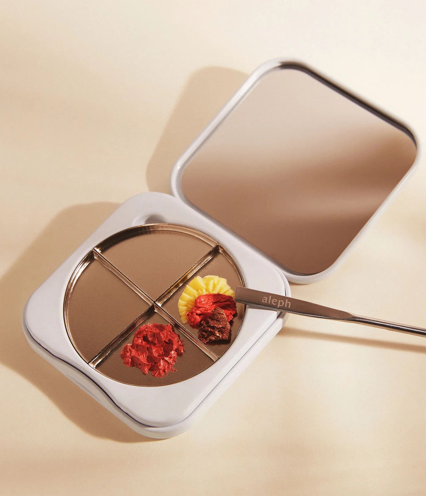 An artist's palette to create bespoke shades, tones and finishes. Blend custom mixes of Aleph Cheek/Lip Tint, Concealer/Foundation, Radiance Balm, Mixing/Treatment Balm and Serum/Primer for ultimate versatility.