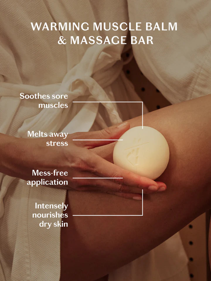 This gently warming muscle balm soothes soreness and melts away stress with a powerhouse blend of comforting arnica, invigorating ginger, and relaxing vanilla. Skin-softening solid melts into a luxurious body oil and deeply nourishes dry skin for the ultimate post-workout indulgence.