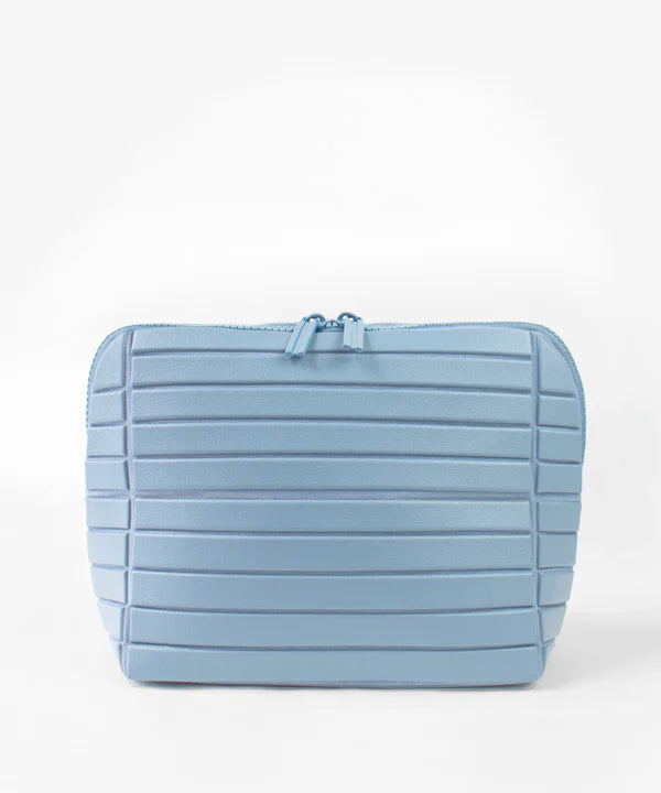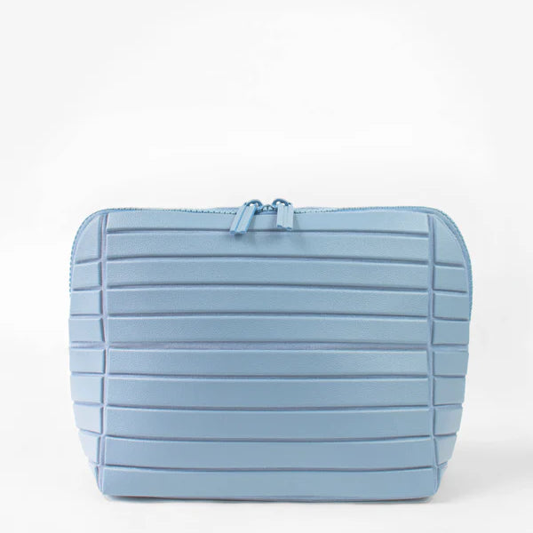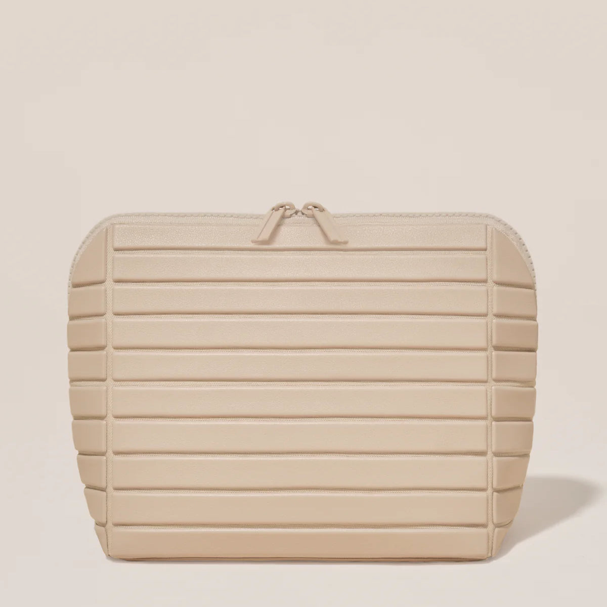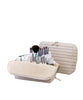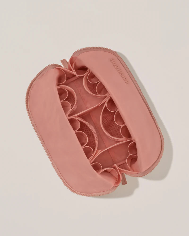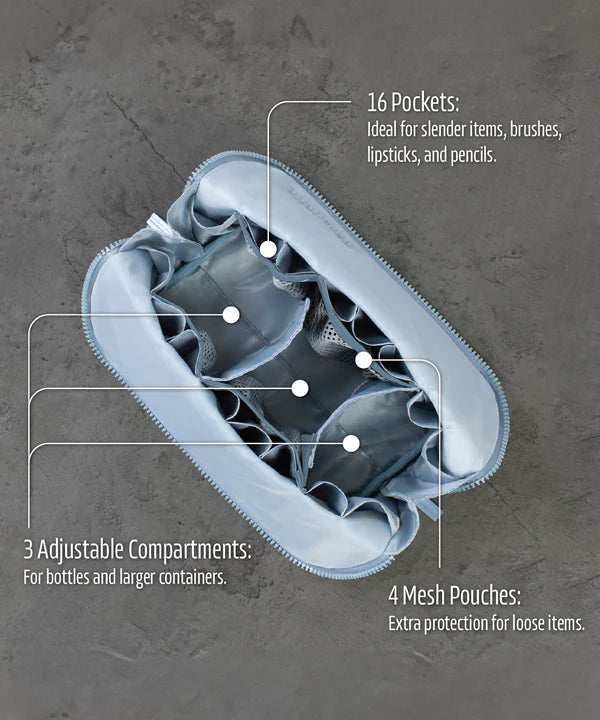 - Partially unzip the zipper halfway to form a sturdy box, turning the bag into a portable vanity. When it's time to go, zip it up and you're good to go!