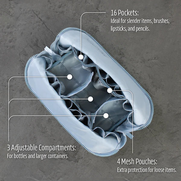 The Carry-On Traveller is designed for the person on the go. Ample room for your everyday essentials, yet compact for travel. Organizing with the Traveller is effortless, with Parallelle's patent-pending foldable shape and user-friendly and flexible compartments. Revolutionize the way you pack by standing your products upright so they are always visible and accessible!