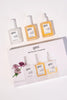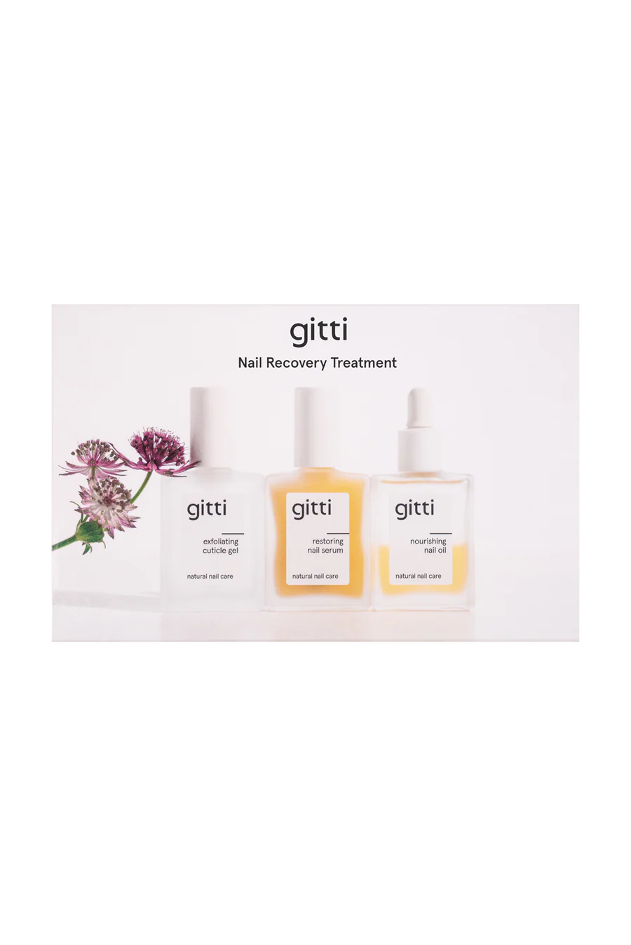The set includes: Exfoliating Cuticle Gel (15 ml), Restoring Nail Serum (15 ml), and Nourishing Nail Oil (14 ml).