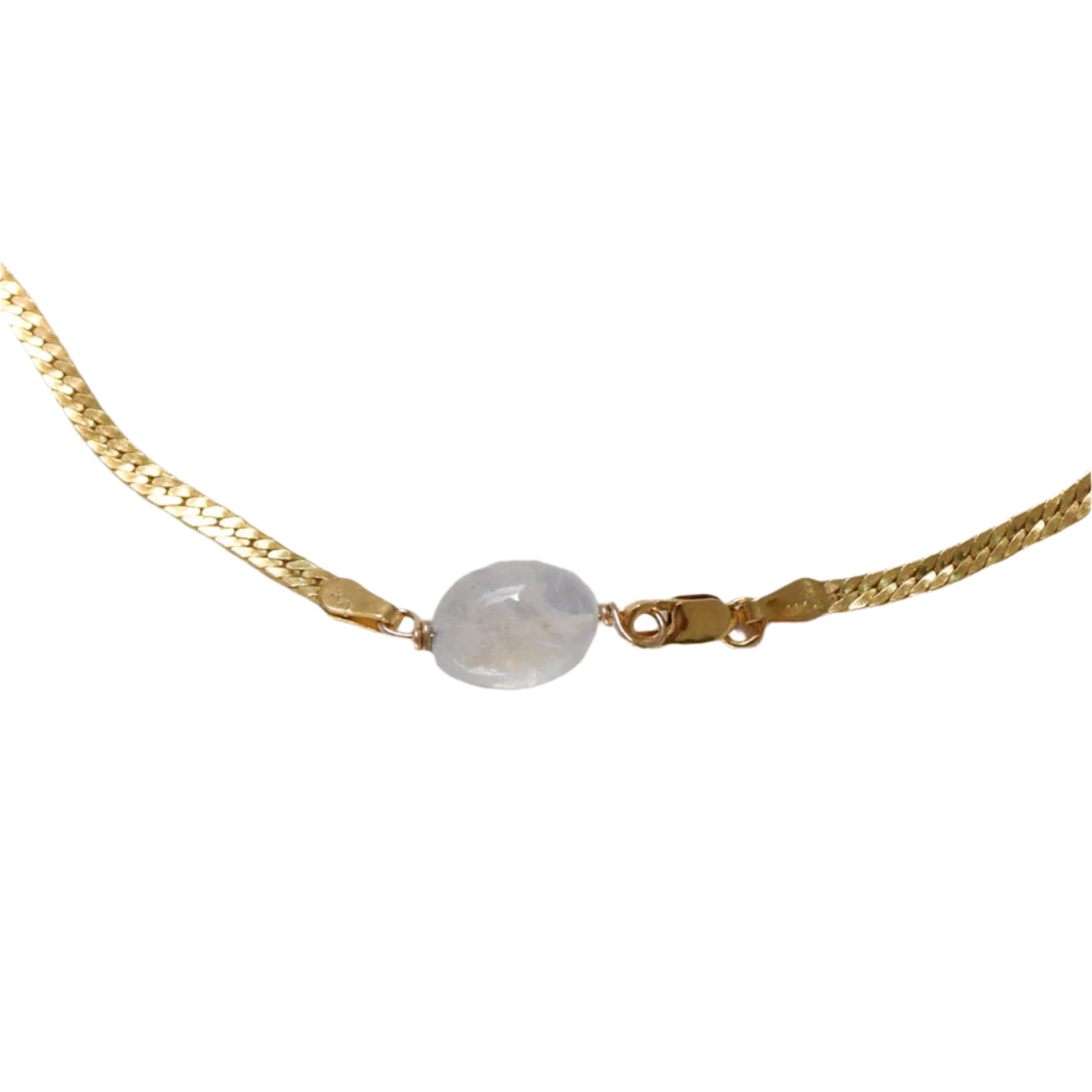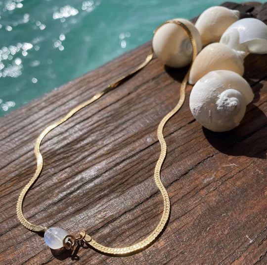 The ultimate layering piece, this beloved jewel is inspired by wanderlust.  The golden herringbone chain symbolizes the journey, while the one-of-a-kind shimmering rainbow moonstone represents where the road ends- and can begin again, whichever direction you seek. Timeless with a twist of vintage glam, the Atlas Necklace is your layering hero, sure to catch plenty of sunny rays.